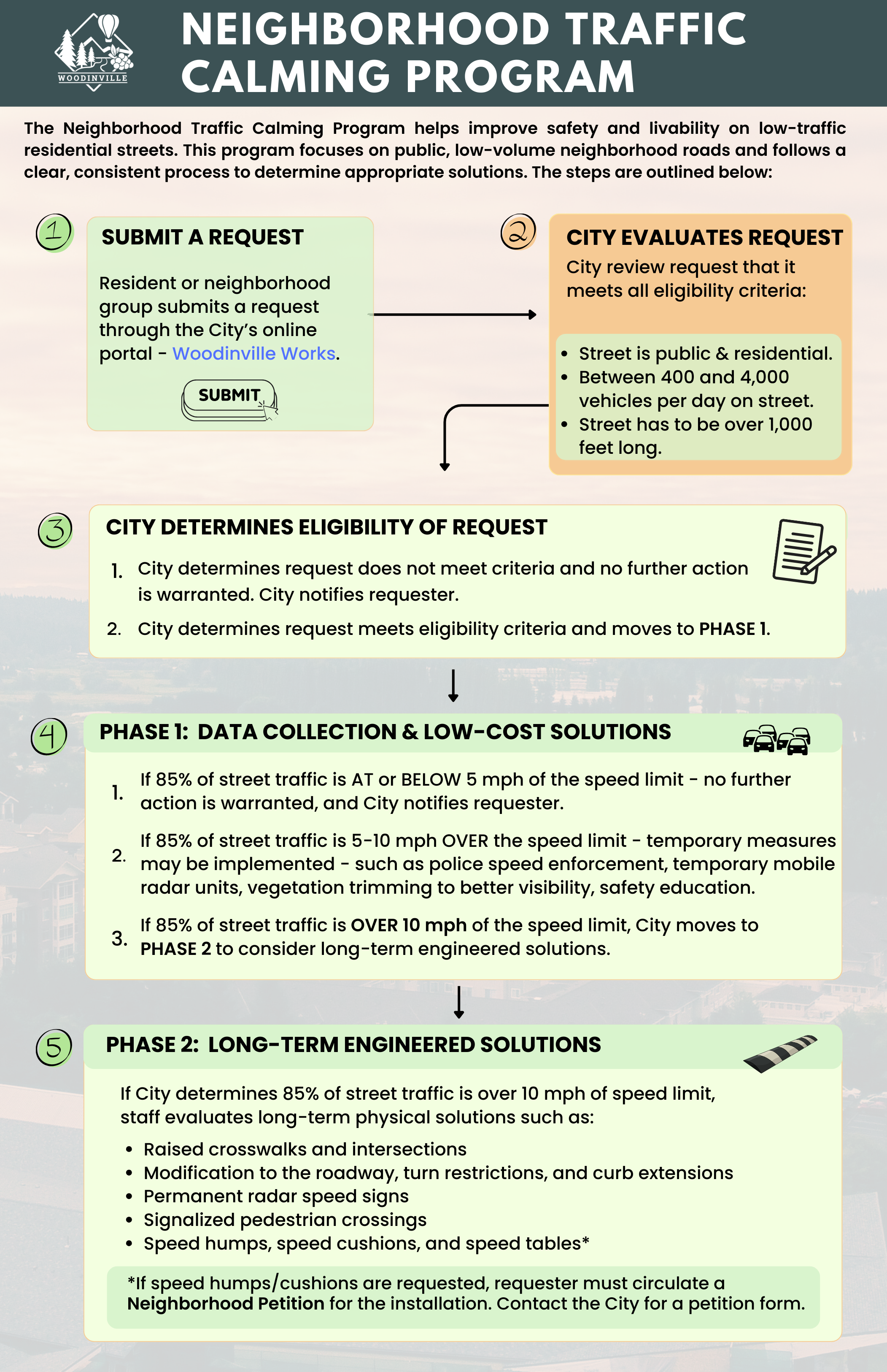 Woodinville’s Neighborhood Traffic Calming Program (NTCP) is a resident-driven, City-supported approach to improving safety and quality of life on our local streets.